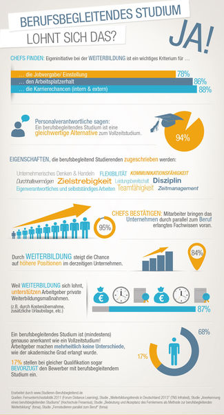 Das Portal Studieren-berufsbegleitend.de hat vor einiger Zeit Studienergebnisse zusammengetragen, die bestätigen, dass sich ein berufsbegleitendes Studium lohnt. Daraus geht hervor, dass die Chance auf eine höhere Position mit einer Weiterbildung um 84 Prozent steigt, sowie dass dreiviertel der befragten Chefs Weiterbildungen für ein wichtiges Kriterium bei der Jobvergabe, dem Arbeitsplatzerhalt sowie den internen und externen Karrierechancen halten. 17 Prozent stellen bei gleicher Qualifikation sogar bevorzugt die Bewerber ein, die ein berufsbegleitendes Studium absolviert haben.
