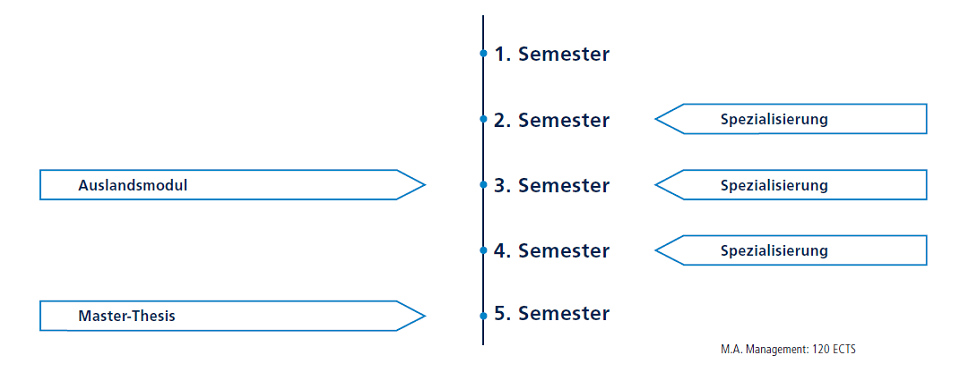 Das berufsbegleitende Studium startet im Wintersemester und dauert fünf Semester. Bis auf das dritte Semester, das ein integriertes Auslandsmodul beinhaltet, und das fünfte Semester mit der Master-Thesis, beginnt jedes Semester mit einer Blockwoche mit Unterricht von Montag bis Samstag. Alle weiteren Vorlesungen finden immer samstags statt.