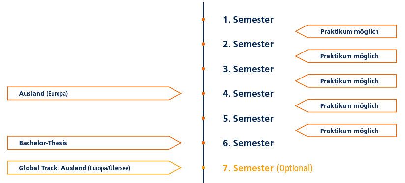 Integriert in Ihr Studium ist ein Auslandssemester an einer Partnerhochschule Ihrer Wahl. Zudem besteht die Möglichkeit, Ihr Studium um ein siebtes Semester zu erweitern und ein weiteres Semester im Ausland zu studieren.